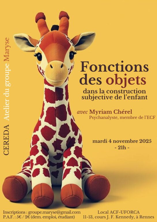 Nous interrogerons donc les fonctions des objets dans la construction psychique de l’enfant, avec pour orientation que l’être parlant est fondamentalement confronté à un manque d’objet. Cette perte d’objet entraîne, pour le sujet, une extraction de jouissance et laisse à sa place un trou, un manque réel. C’est à partir de là que prendra consistance le fantasme, la voie d’une recherche de l’objet perdu.