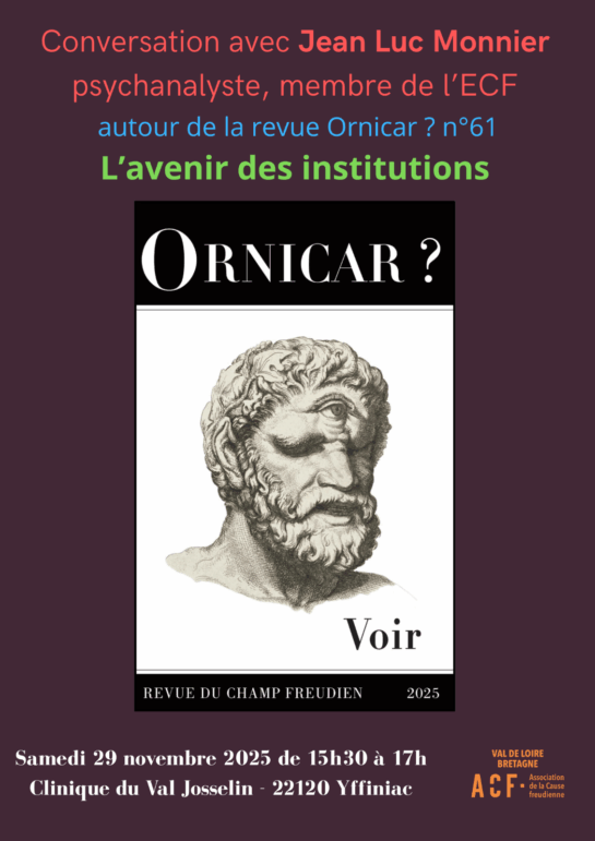 Conversation avec Jean Luc Monnier, psychanalyste, membre de l’ECF et de l’AMP, autour du dossier « L’avenir des institutions » dans la revue Ornicar? Voir qui se fait l’écho des enjeux contemporains des institutions et des manières dont s’institue ce qui s’y invente.