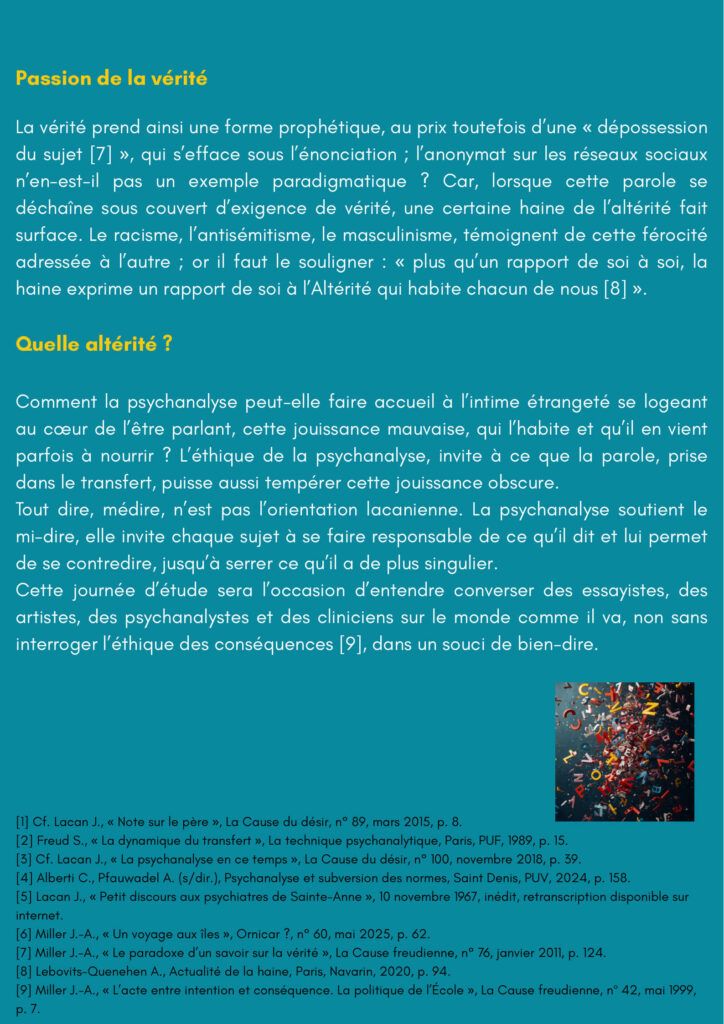 Cette journée d’étude du bureau de l’ACF en VLB, pôle de Rennes, sera l’occasion d’entendre converser des essayistes, des artistes, des psychanalystes et des cliniciens, le samedi 21 mars 2026 à Rennes.