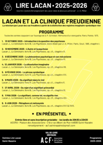 LIRE LACAN 2025-2026 Ville : Saint-Nazaire Lundi 8 juin 2026 / 20h30 - 22h30 Catégorie : Soirée PROGRAMME DE L’ANNEE – SAINT-NAZAIRE Informations En présentiel – Entrée libre – Sans inscription préalable AGORA – Maison des associations 2 bis rue Albert de Mun 44600 Saint-Nazaire Contact acf.saintnazaire@gmail.com