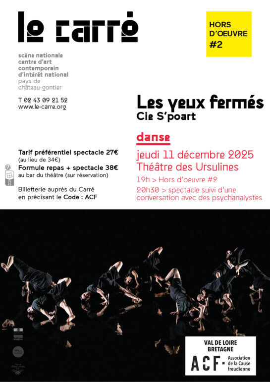 Mickaël Le Mer, chorégraphe de la compagnie Spoart s’inspire pour ce spectacle « Les yeux fermés » de l’œuvre de Pierre Soulages. Les créations de Soulages produisent un décalage immédiat, extraterritorial, hors du champ perceptif habituel. Soulages initie chez celui qui regarde un parcours, un détour, creuse un vide, dans tous les cas une recherche. La peinture de Soulages repose sur la lumière, née, soit du contraste du noir, soit de sa réflexion. Il est le premier artiste à utiliser le reflet, jusqu’alors considéré comme un parasite. Sur fond d’absence (de couleur, de mot, de titre, de sens), Soulages donne à voir. Libre à chacun de l’accepter ou de le refuser. Sa peinture est vibratoire, percussion sur le corps, ouvrant un espace pour le silence et l’émotion. La création de Soulages semble une manière d’approcher l’indicible, l’irreprésentable. Comment la danse s’en saisit-elle pour permettre le mouvement ? Émilie Chesne, « Miss Pompon », créatrice de bijoux, artiste, viendra discuter avec nous lors du Hors d’œuvre et notamment de la manière dont le travail de Pierre Soulages l’a inspirée.