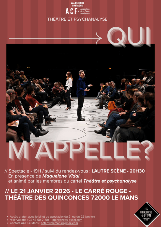 À l’issue du spectacle les membres du cartel théâtre et psychanalyse proposent une conversation avec l’autrice Maguelone Vidal. Pour Lacan : « On ne voit bien les choses qu’au niveau du nom propre. Comme disait l’autre, le nom (…) c’est ce qui appelle à parler. »* Notre nom de famille, quelle histoire raconte-t-il ? Qu’est-ce que l’Autre qui m’a transmis ce nom, donné ce prénom, qui a créé pour moi des « petits noms », de curieux surnoms, a rêvé, voulu, désiré pour moi ? Quels secrets sont cachés ou révélés dans ce choix ? Quel sens, quel goût, quel sentiment ce désir a-t-il donné à ma vie ? Quelle jouissance se déchaîne parfois dans une volée de « nom d’oiseaux » ? Et si au lieu de subir notre nom, nous l’inventions ? Est-il possible de se nommer sans en passer par l’Autre ? Comment choisir ce nom nouveau ? S’incarne-t-il ou s’éprouve-t-il ? Et comment ?