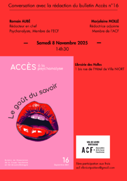 Lire la suiteConversation la rédaction du Bulletin Accès à la psychanalyse n°16 « Le goût du savoir ». Romain AUBE et Marjolaine MOLLE proposent…