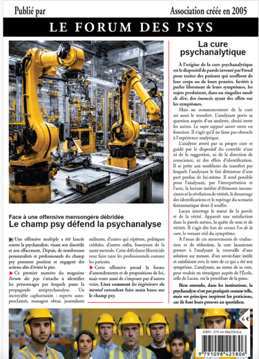 - Ce premier numéro du magazine Forum des psys s’attache à identifier les personnages par lesquels passe la propagande antipsychanalyse. Un incroyable capharnaüm : experts autoproclamés, managers obtus, journalistes militants, d’autres qui répètent, politiques crédules, d’autres enfin, fossoyeurs de la santé mentale. Cette déferlante liberticide veut faire taire les professionnels comme les patients.